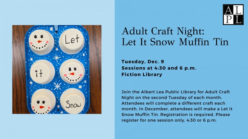 Add to Calendar Tuesday, December 9, 2025 4:30 pm 12/09/2025 6:00 pm America/New_York Adult Craft Night: Let It Snow Muffin Tin Join the Albert Lea Public Library for adult craft night on the second Tuesday of each month. Attendees will complete… Albert Lea, MN United States