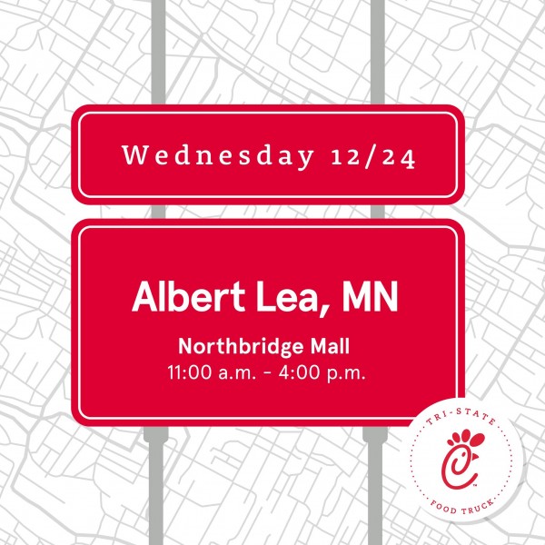Add to Calendar Wednesday, December 24, 2025 11:00 am 12/24/2025 4:00 pm America/New_York Chick-fil-A Christmas Eve in Albert Lea! Swing by the Chick-fil-A® Food Truck and grab a festive favorite before the holiday begins.… Albert Lea, MN United States