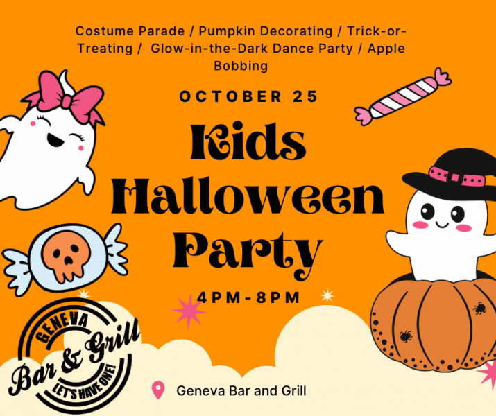 Mark your calendars! Geneva Bar and Grill is hosting the ultimate Kid’s Halloween Party on Saturday, October 25th, and you’re invited! We’ve packed the afternoon and evening with creative crafts, classic games, and a glowing dance party.