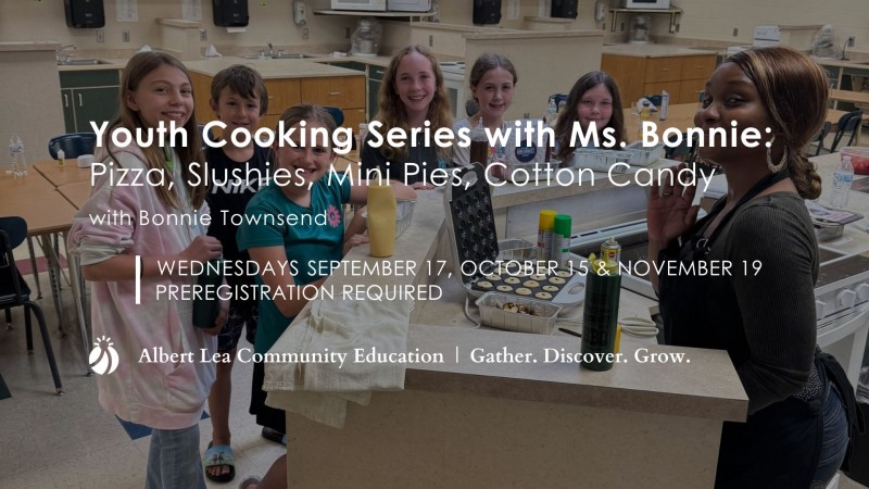 Add to Calendar Wednesday, November 19, 2025 3:30 pm 11/19/2025 5:30 pm America/New_York Youth Cooking with Ms. Bonnie Grades 3-12 Preregistration is required. Register by clicking the ‘Tickets’ link, calling our office at 507-379-5318, or visiting Brookside Education Center during… Albert Lea, MN United States