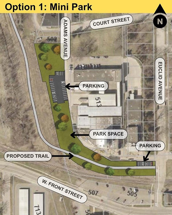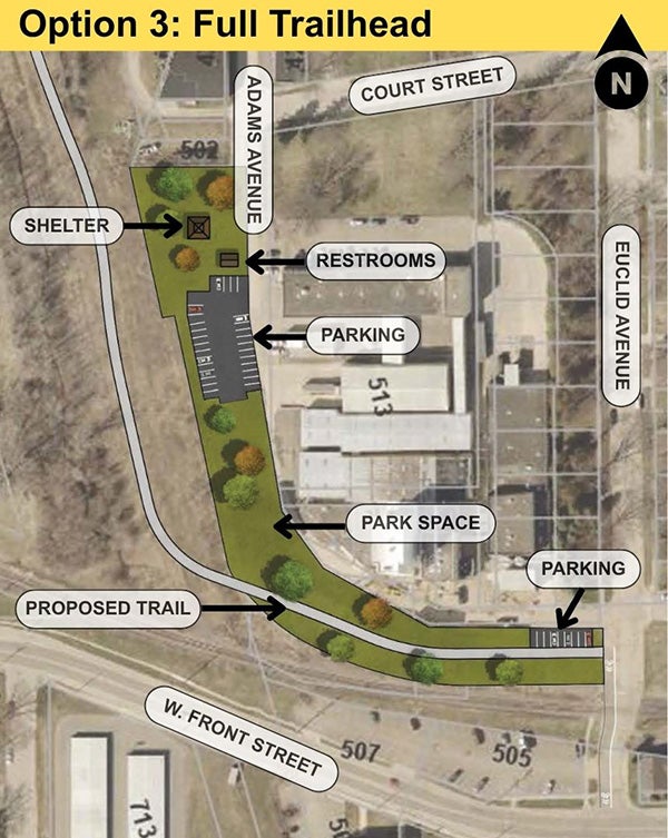 All three options would include parking for the proposed Songbird Trail along the former UP rail corridor. The City of Albert Lea and Freeborn County have received three state grants to start developing this trail that would eventually run from Front Street to Shoff Park, across Minnesota Highway 13, and then to Hartland.