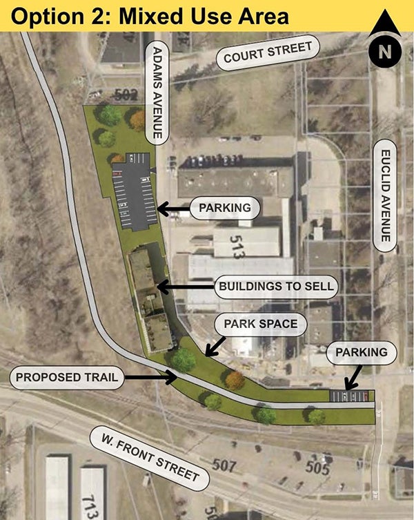 - Mixed Use Area: Remove the hazardous buildings and leave the three structurally sound buildings to sell to a private business for reuse. The City would develop the rest of the area into greenspace with parking and perhaps other amenities.